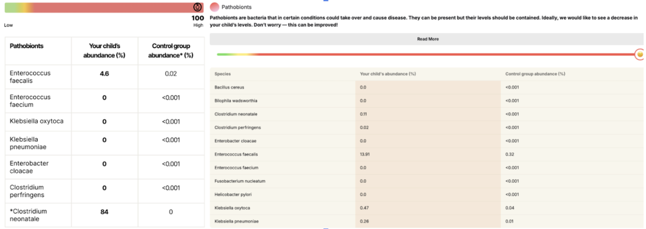 First, both twins showed very high levels of Clostridium neonatale, a “bad” bacterium often found in premature infants and associated with early gut instability.