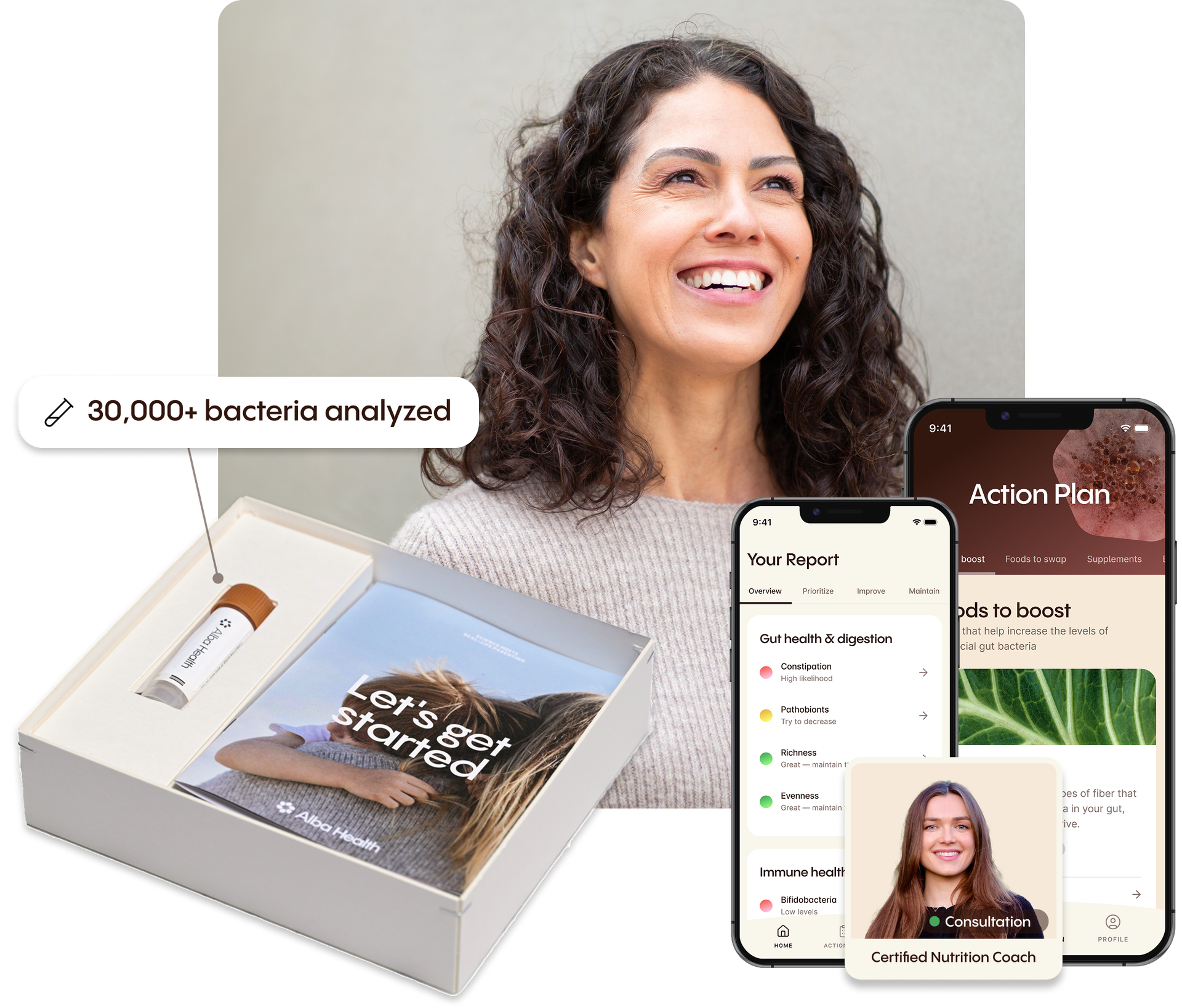 Your Alba journey includes everything you need to understand and support your gut health – from easy at-home sampling to a detailed microbiome report, personalized guidance, and expert support in the app.